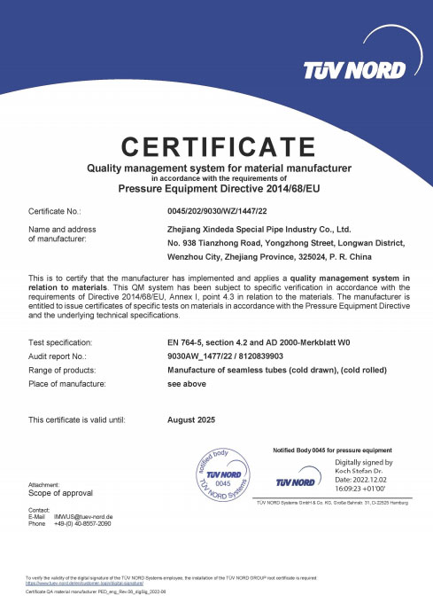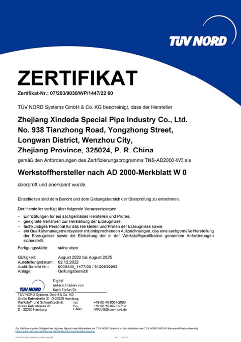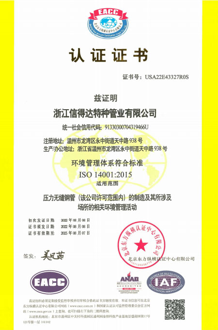 公司已全面通過了ISO9001:2008質(zhì)量管理體系認證、14000環(huán)境管理體系認證、18000職業(yè)健康管理體系認證、國家質(zhì)量檢驗檢疫總局A2-B類壓力管道元件制造許可、 歐盟PED認證及德國AD-2000產(chǎn)品強制認證、美國ASME材料產(chǎn)品認證、信得達擁有1條穿孔生產(chǎn)線,10條冷拔生產(chǎn)線8條冷軋?zhí)胤N無縫鋼管生產(chǎn)線。